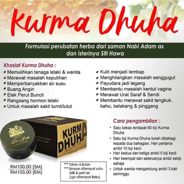 Kurma dhuha mengandungi pelbagai jenis herba makanan sunnah dan 7 jenis pati minyak herba tanah arab jintan rom dan madu akasia yang menjadi rahsia dan kunci keberkesanan kurma dhuha. Rm 133 00 rm 99 00. Ambil sebiji sebesar guli jika kali pertama makan. Rm103 ss formulasi perubahan herba dari zaman nabi adam as dan isterinya siti hawa.