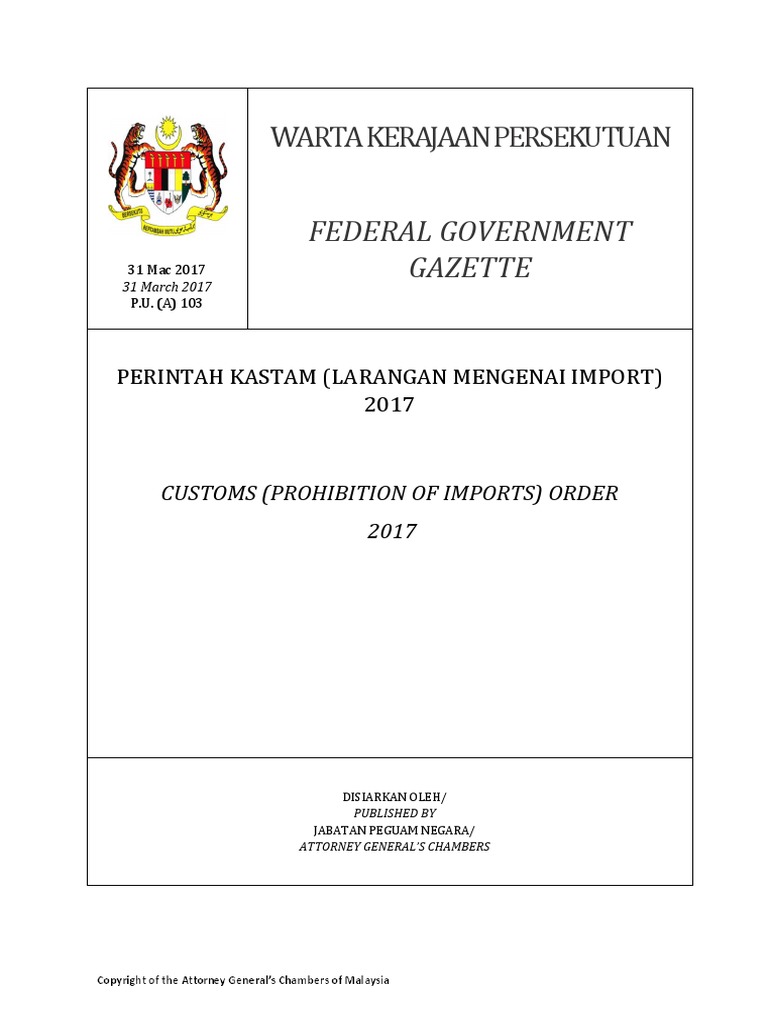 Perintah Kastam Larangan Mengenai Import 2017 Customs Prohibition Of Imports Order Pdf Free Download