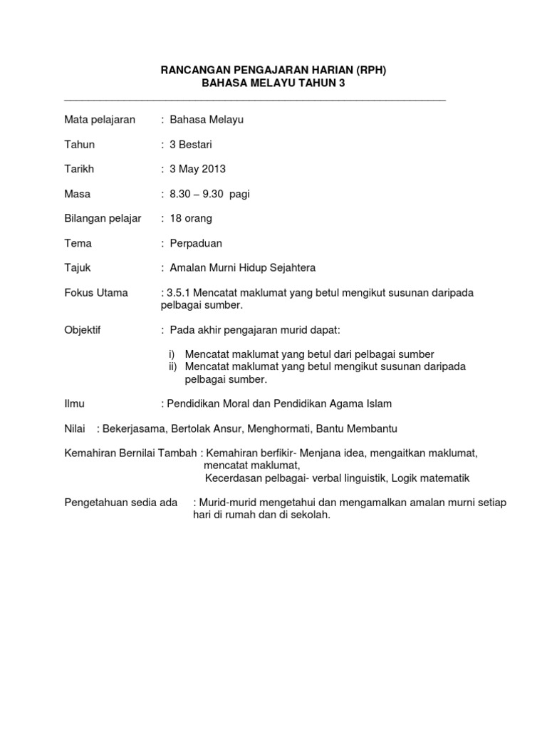Rancangan Pengajaran Harian Kssr Bahasa Melayu Tahun 3